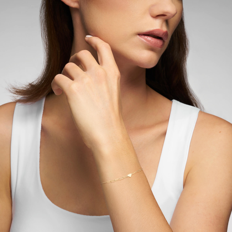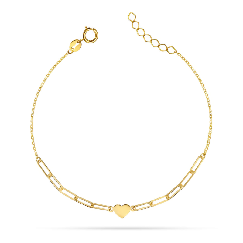 Złota bransoletka celebrytka z sercem to biżuteria, która łączy w sobie subtelność, elegancję i wyjątkowy, osobisty charakter. Delikatny łańcuszek z finezyjnymi ogniwami pięknie układa się na nadgarstku, a niewielkie serduszko dodaje jej kobiecego wyrazu.