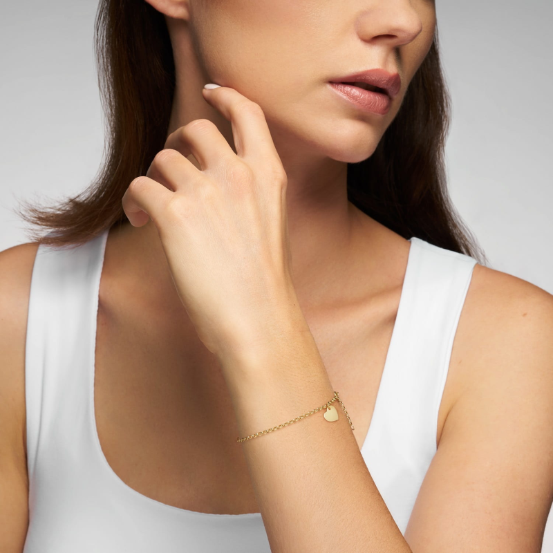 Złota bransoletka rollo z połyskującym, gładkim serduszkiem to biżuteria, która zachwyca swoją delikatnością i elegancją. Wykonana ze złota próby 585, jest lekka, subtelna i jednocześnie niezwykle efektowna. Misterny splot rollo pięknie odbija światło, a minimalistyczna zawieszka w kształcie serca dodaje jej romantycznego, dziewczęcego charakteru.