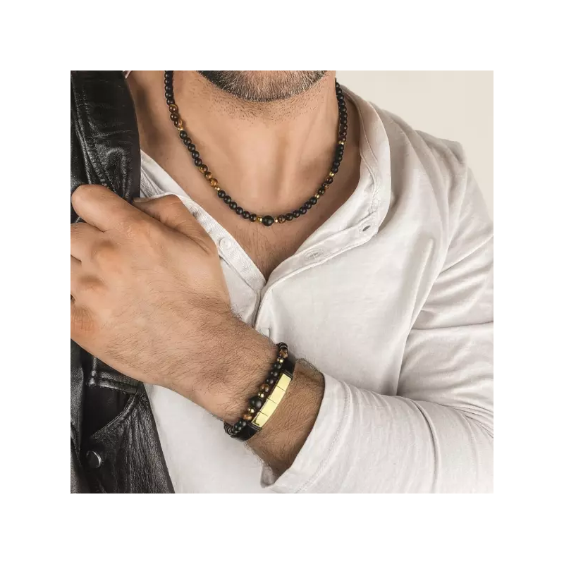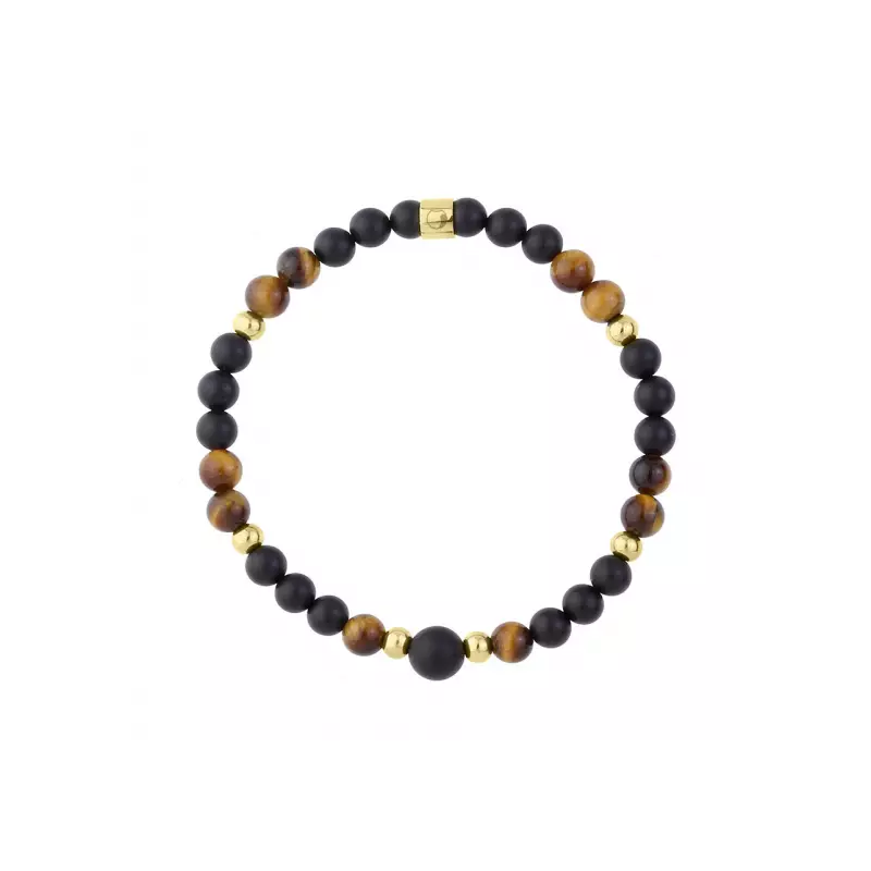 Ta stylowa bransoletka została wykonana z naturalnych, polerowanych kamieni tygrysiego oka oraz onyksu, tworząc harmonijne połączenie męskiej energii i elegancji. Tygrysie oko zachwyca wyjątkową opalizacją — w zależności od kąta padania światła mieni się odcieniami brązu, miodu i złota, podkreślając dynamiczny charakter biżuterii. Onyks wnosi głębię, kontrast oraz symbolikę siły i stabilności.