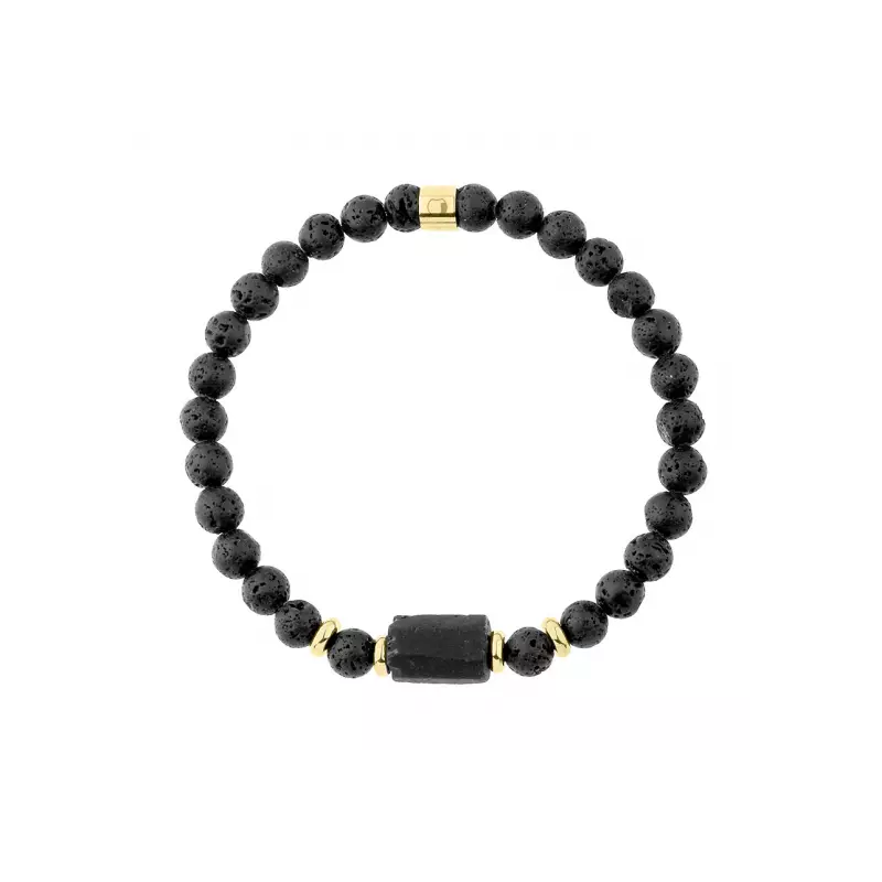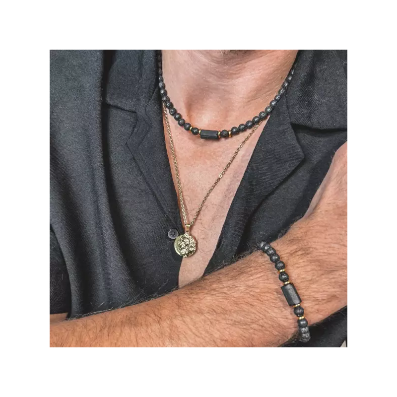 Ta stylowa bransoletka męska została wykonana z połączenia surowej bryły naturalnego turmalinu oraz matowej lawy wulkanicznej, tworząc efektowną kompozycję o minimalistycznym, a jednocześnie wyrazistym charakterze. Surowy turmalin przyciąga wzrok swoją niepowtarzalną strukturą i głębią koloru, natomiast lawa wulkaniczna zachwyca naturalną, pęcherzykowatą fakturą oraz symboliczną energią.
