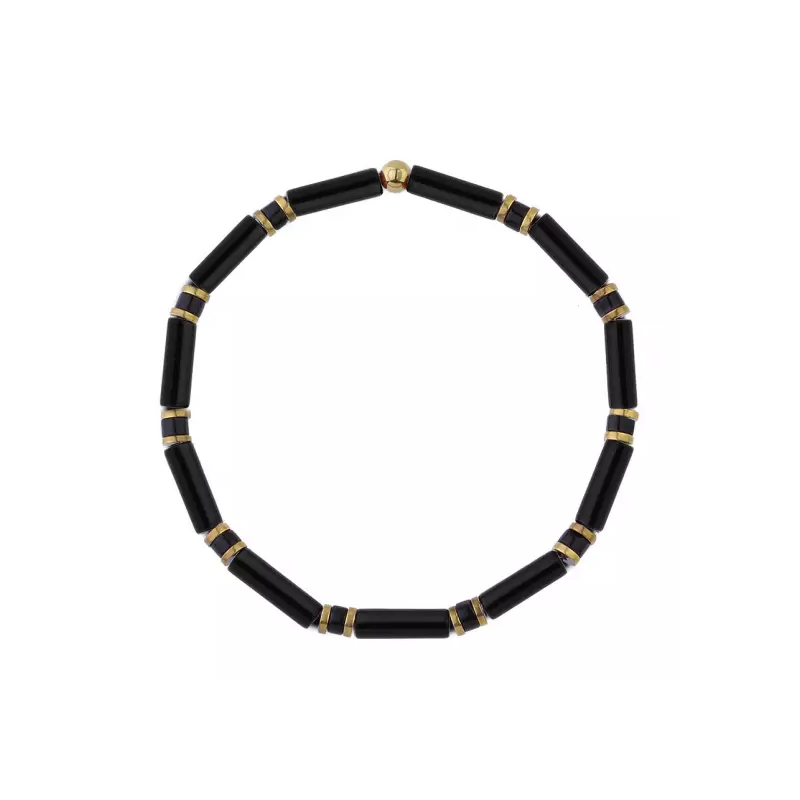 Podłużne koraliki onyksu nadają bransoletce nowoczesny, męski wygląd, a złote przekładki z hematytu wprowadzają subtelny, luksusowy blask. Hematyt to kamień kojarzony z równowagą, koncentracją i klarownością myśli, a jego metaliczna struktura pięknie kontrastuje z głęboką czernią onyksu.
