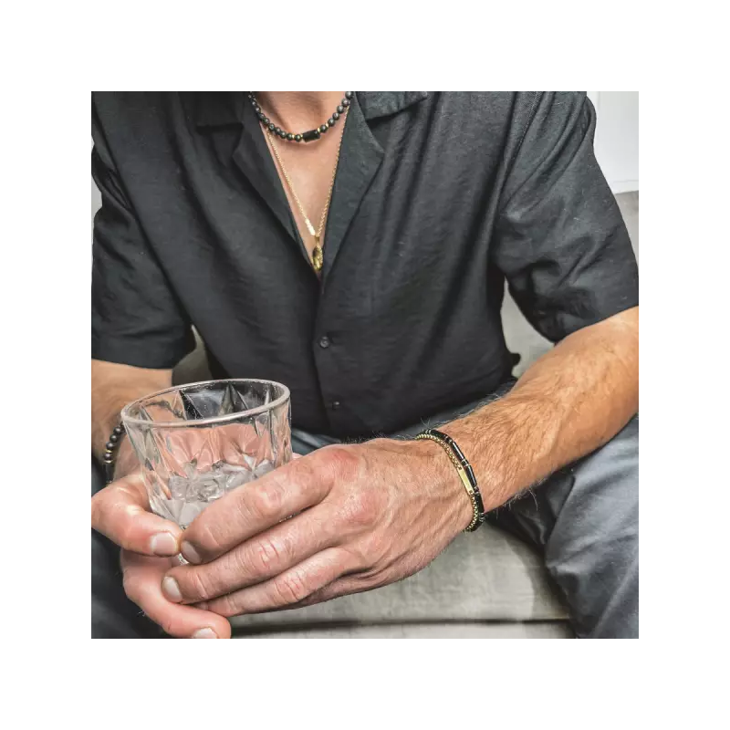 Ta męska bransoletka z naturalnych kamieni zachwyca połączeniem lśniącego czarnego onyksu oraz złotego hematytu, tworząc elegancki i ponadczasowy dodatek o wyrazistym charakterze. Onyks, znany jako kamień siły i determinacji, symbolizuje ochronę, stabilność i pewność siebie — dlatego jest idealnym wyborem dla mężczyzny, który chce podkreślić swoją wewnętrzną energię i charakter.