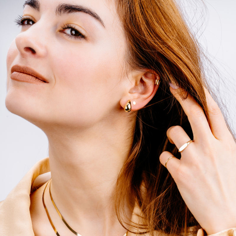 Te precyzyjnie wykonane złote kolczyki zachwycają subtelną formą i wyjątkową elegancją. Powstałe ze złota próby 585, wyróżniają się gładką, harmonijną linią, w której kropla — symbol kobiecości i delikatności — nabiera nowoczesnego, luksusowego charakteru.