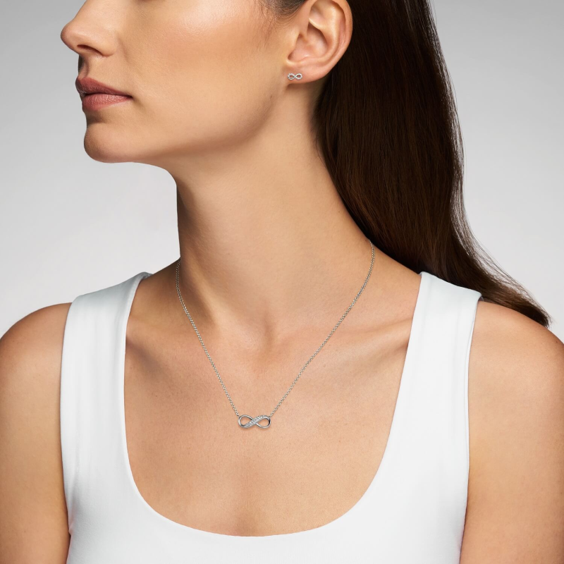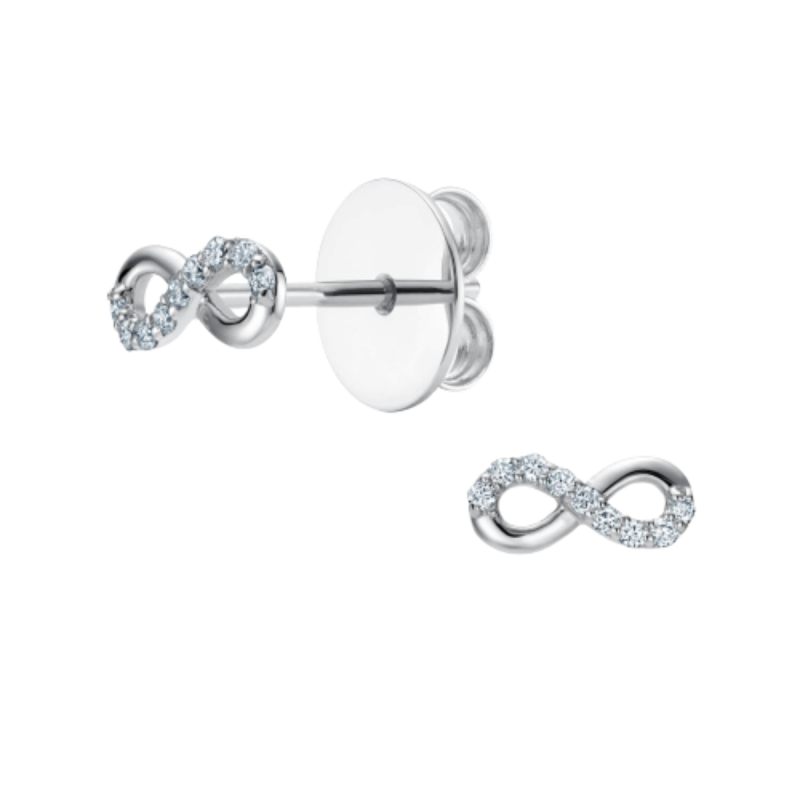 Symbol nieskończoności został dodatkowo ozdobiony lśniącymi białymi cyrkoniami, które pięknie odbijają światło, dodając kolczykom subtelnej, kobiecej iskry. Komfortowe zapięcia na sztyft sprawiają, że model jest lekki, wygodny i doskonale układa się na uchu.