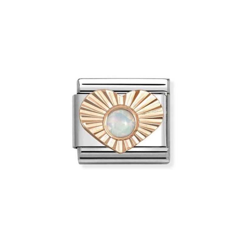 Element Nomination Italy z diamentowanym sercem i białym opalem to wyjątkowy moduł, który doda Twojej bransoletce Composable® subtelnego blasku i osobistego charakteru. Wykonany z 9-karatowego złota osadzonego na trwałej stali szlachetnej, zachwyca misterną diamentowaną fakturą oraz delikatną grą kolorów naturalnego opalu.