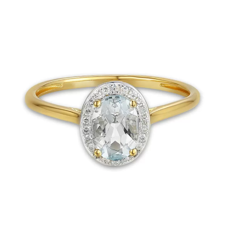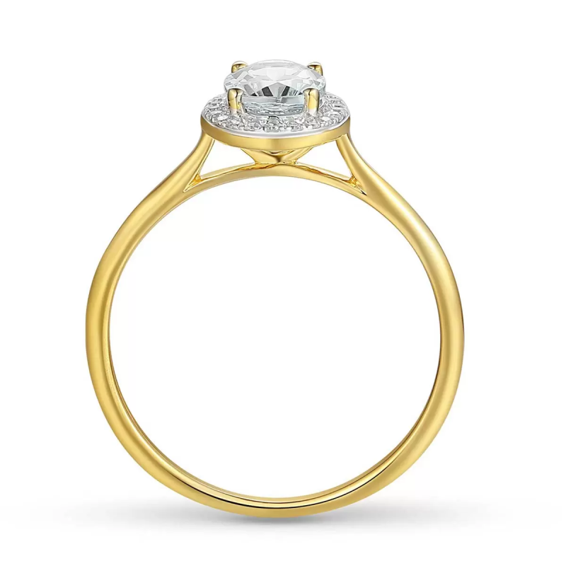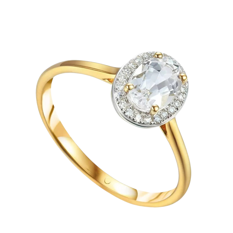 Topaz otoczono kompozycją 22 diamentów o łącznej masie 0,07 ct, które dodają pierścionkowi przestrzenności i wyrafinowanego świetlistego akcentu. Połączenie owalnego szlifu topazu i diamentowej oprawy tworzy formę luksusową, a jednocześnie delikatną – idealną dla kobiet kochających subtelne, a przy tym efektowne detale.