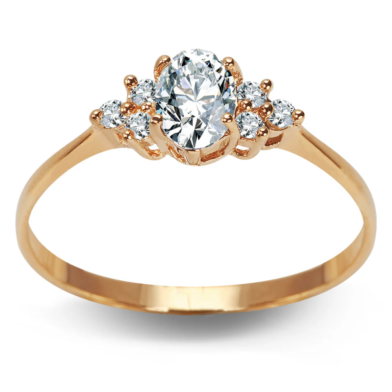 Ten zachwycający pierścionek wykonany ze złota próby 333 to połączenie klasycznej elegancji z olśniewającym blaskiem. Centralna, owalna cyrkonia została osadzona w finezyjnej, wielokamieniowej oprawie typu karmazycja, dzięki temu pierścionek pięknie rozświetla dłoń i dodaje całości luksusowego charakteru.