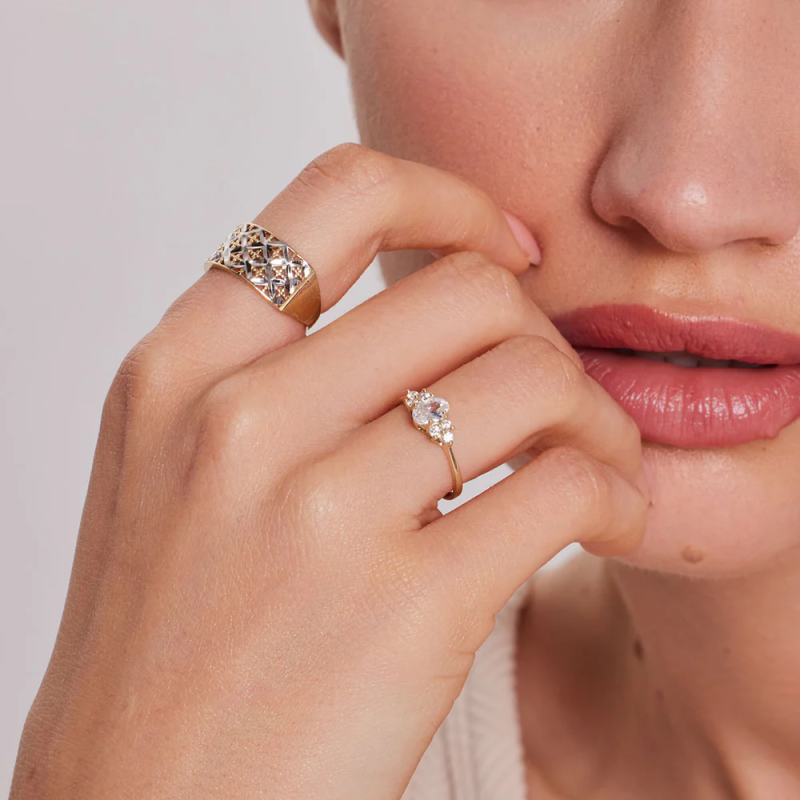 Delikatna, smukła szyna subtelnie podkreśla kompozycję kamieni, tworząc biżuterię idealną na wyjątkowe okazje — szczególnie na zaręczyny. To wybór dla kobiet, które kochają romantyczne detale, wyraźny blask i ponadczasowy styl.