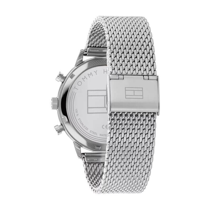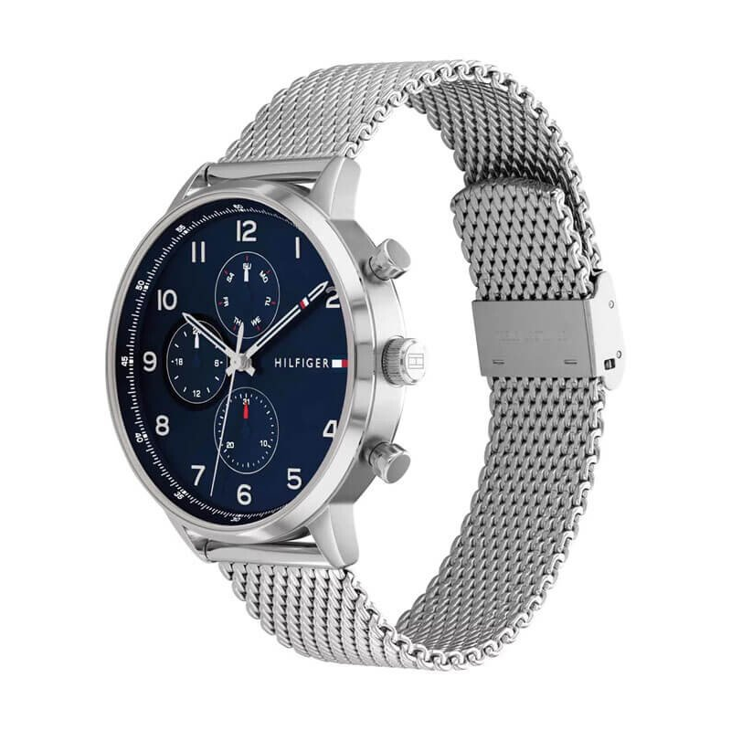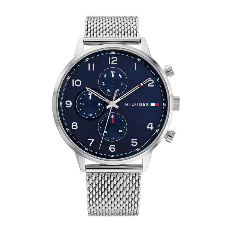 Tommy Hilfiger 1792078 zegarek dla mężczyzn z mechanizmem kwarcowym. Srebrna koperta ze stali nierdzewnej średnicę 44 mm, a zakręcany dekiel zwiększa jej trwałość. Niebieska tarcza z analogowym wyświetlaczem jest wyposażona w cyfry arabskie oraz luminescencyjne podświetlenie, co ułatwia odczyt czasu po zmroku. Bransoleta typu mesh, wykonana z srebrnej stali, jest łatwa do samodzielnej regulacji.